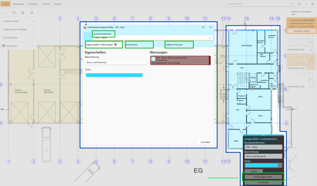 Um umfangreichere sSK mit mehreren, editierbaren, sowie auch über mehrere Geschosse hinweg zusammenfassbaren Auslösebereichen zu erstellen, können Sie jederzeit auf telani Next upgraden.