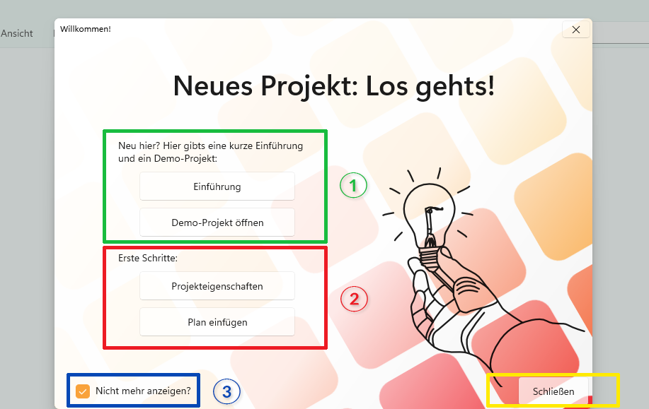 Dieses Fenster erscheint in regelmäßigen Abständen bei neuen Projekten/Konzepten immer wieder. Möchten Sie es sich in Zukunft nicht mehr anzeigen lassen, setzen Sie einen Haken in die entsprechende Checkbox (3).