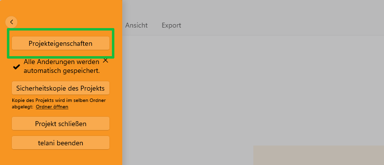 Klicken Sie im Menüpunkt „Projekt“ auf den Button Projekteigenschaften, um das Projektmenü zu öffnen (siehe Abb.9).